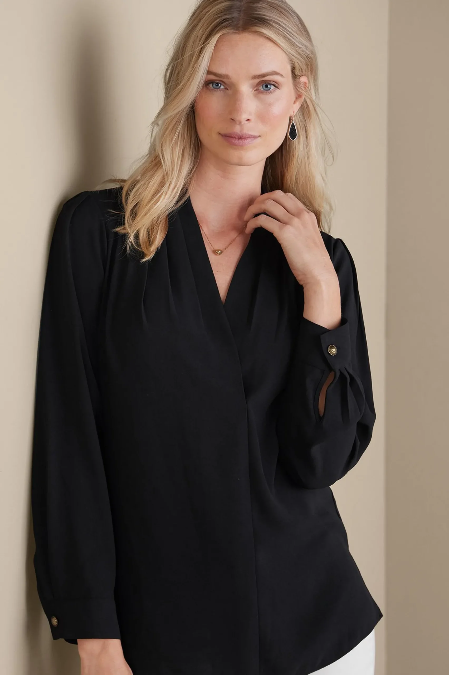 Every closet needs a can’t-miss blouse – a refined layer that seamlessly works across your entire wardrobe. Pretty pleating makes the crossover V-neck of this blouse drape so beautifully, while hammered buttons finish the long sleeve cuffs. Side slits.