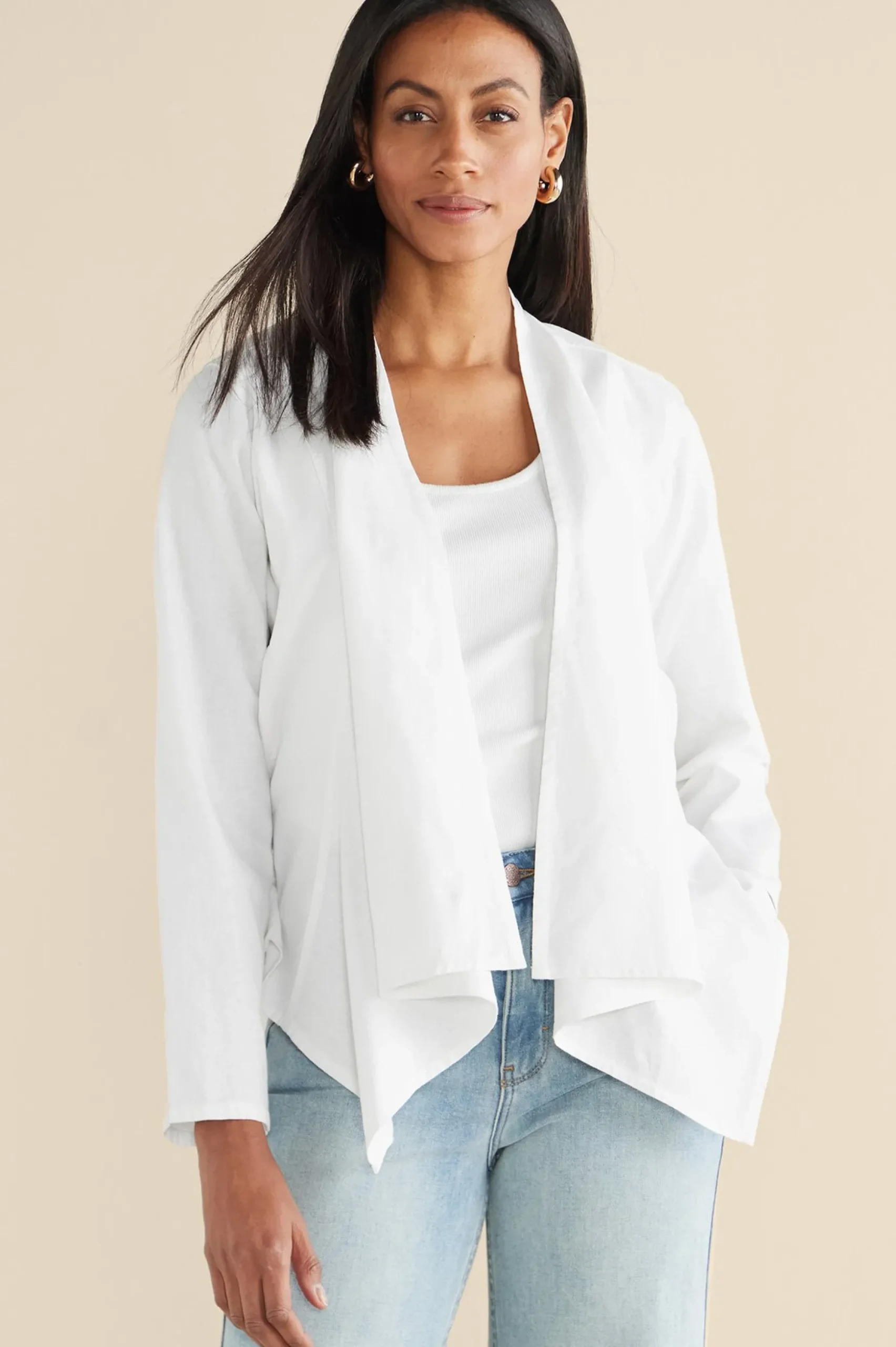At ease in a comfortable linen blend fabric, this topper is an essential for breezy days and cool evenings. Designed with a drapey front with princess seams to create a shapely silhouette, and hem tabs at the back waist that allow you to add more definition if desired.