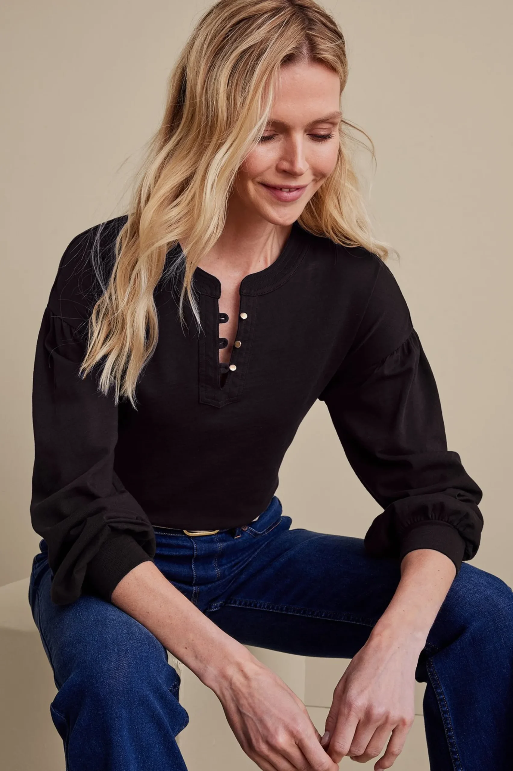 We love taking a basic cotton top and adding unique details to make it special, all with comfort and ease in mind. This knit top embraces the statement sleeve trend with a blouson design, flirty shirring at the dropped shoulders, and easy knit cuffs. A Mandarin collar with a button-tab placket is fresh and interesting. You’ll want this in both colors!