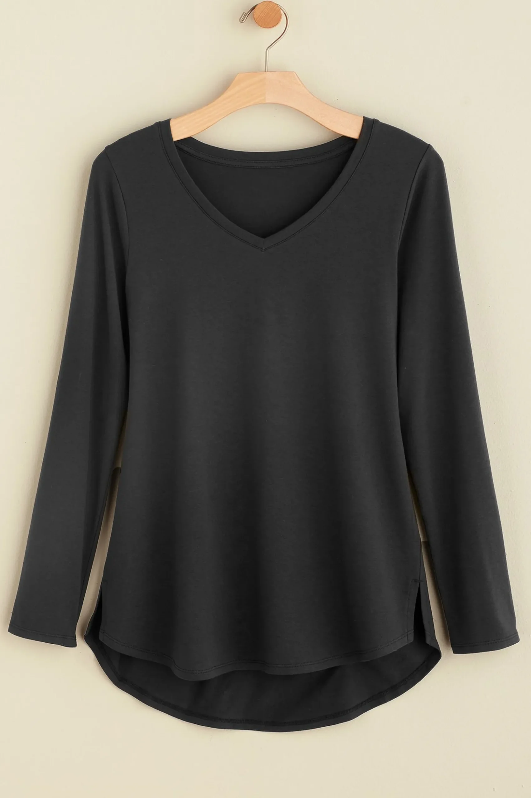 We crave softness in our basic tees and this V-neck is so soft! We designed it with Pima cotton, the softest cotton on the planet, with just a whisper of stretch to maintain its shape. The curved hem dips slightly longer in back with petite side slits in front adding extra ease.