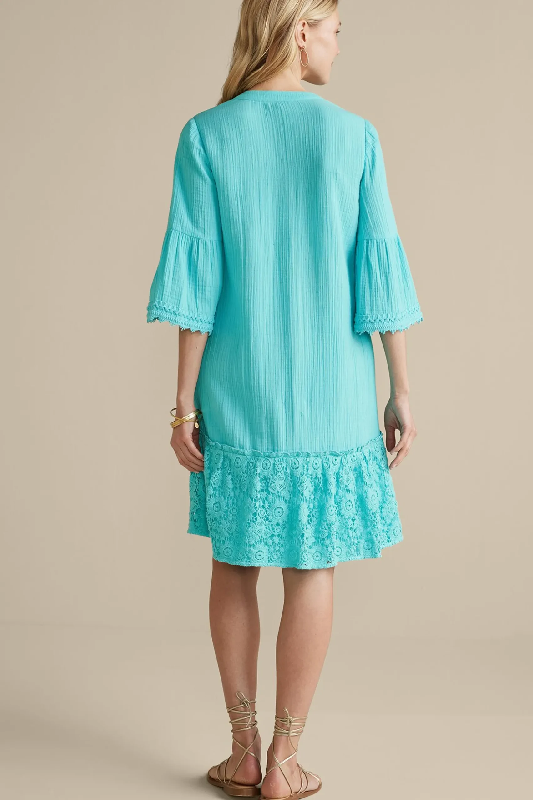 Island bound or boutiquing with friends, we have mad love for cotton gauze. Its carefree vibe matches the season, and it always looks fresh even when the temperatures soar. We’ve taken our signature gauze and styled it in a chic new dress: A-line design with a dramatically deep tier of floral lace, 3/4 sleeves that deeply bell (the better to show off your jewels), and a V-neck placket detailed with lace. The effortless look switches easily from beach to bistro with thong sandals or stylish wedges.