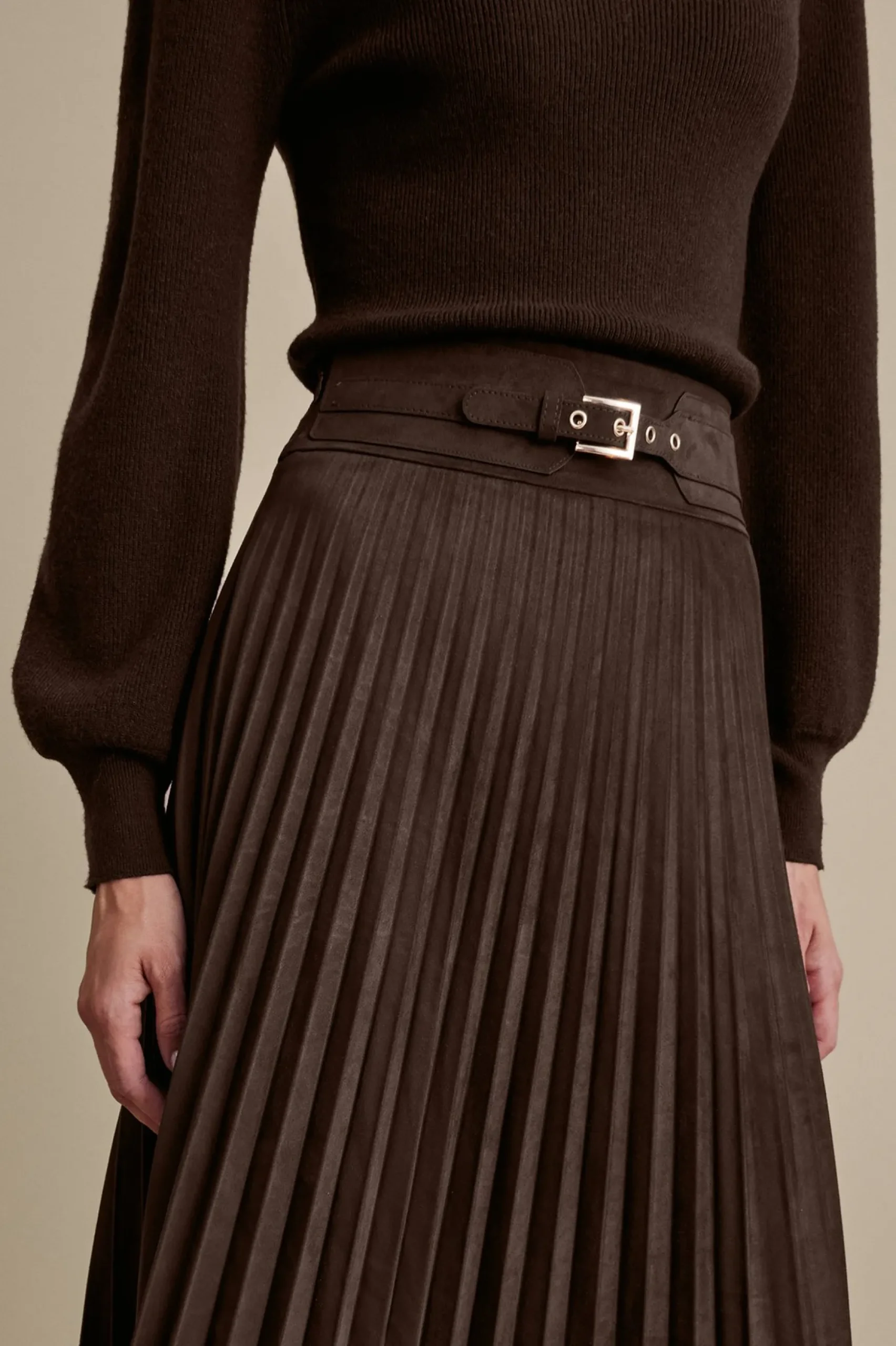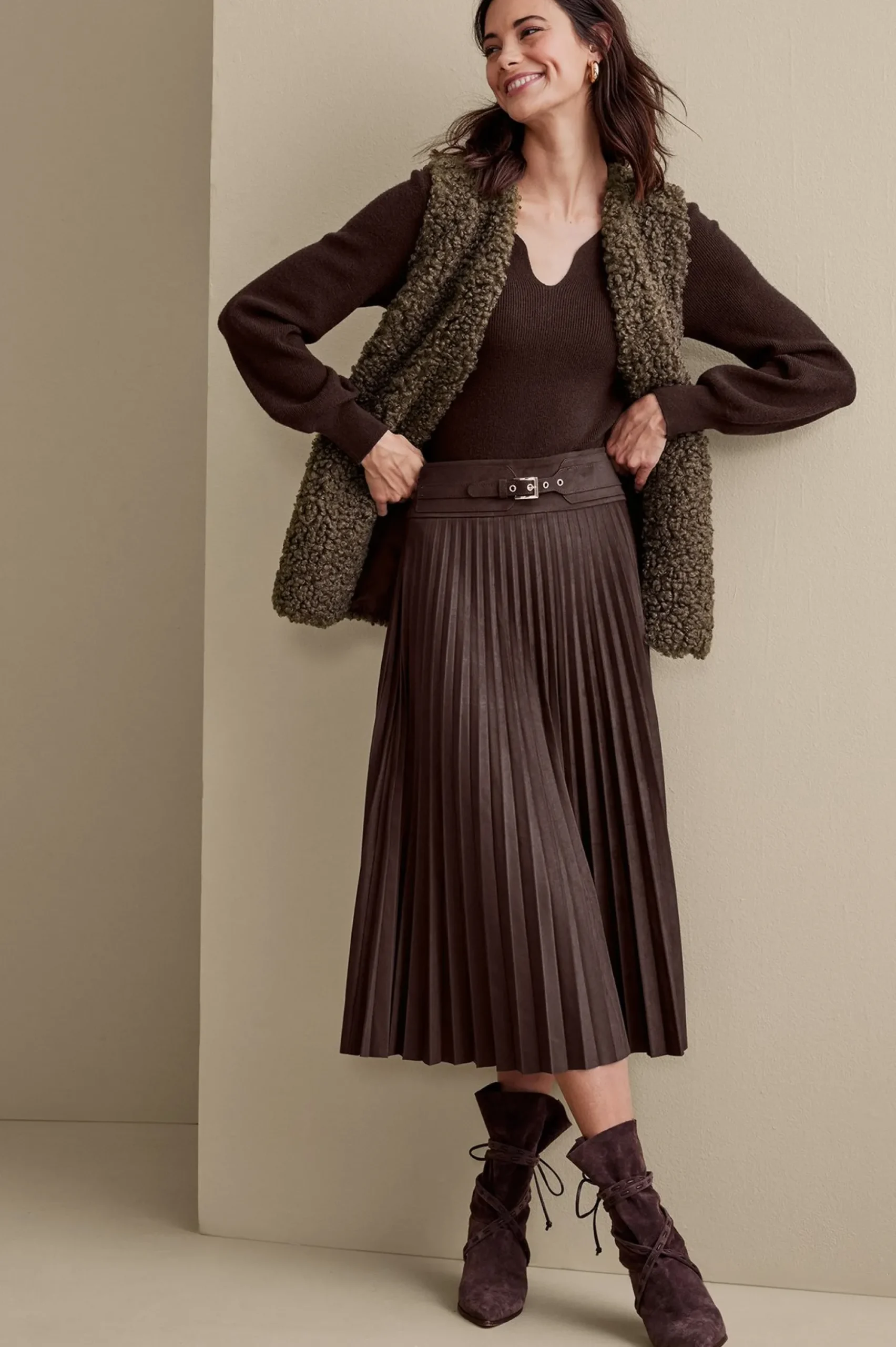 Pleats, please! Our faux suede feels like a dream and wears so beautifully. Here, we’ve crafted it into a super stylish skirt with gorgeous pleating for swingy fullness. Tuck in a blouse or wear it with a sweater, it’s such a chic statement. Back smocking lends extra ease of wear. Adjustable gold tone buckle detail. Side zip, full lining.