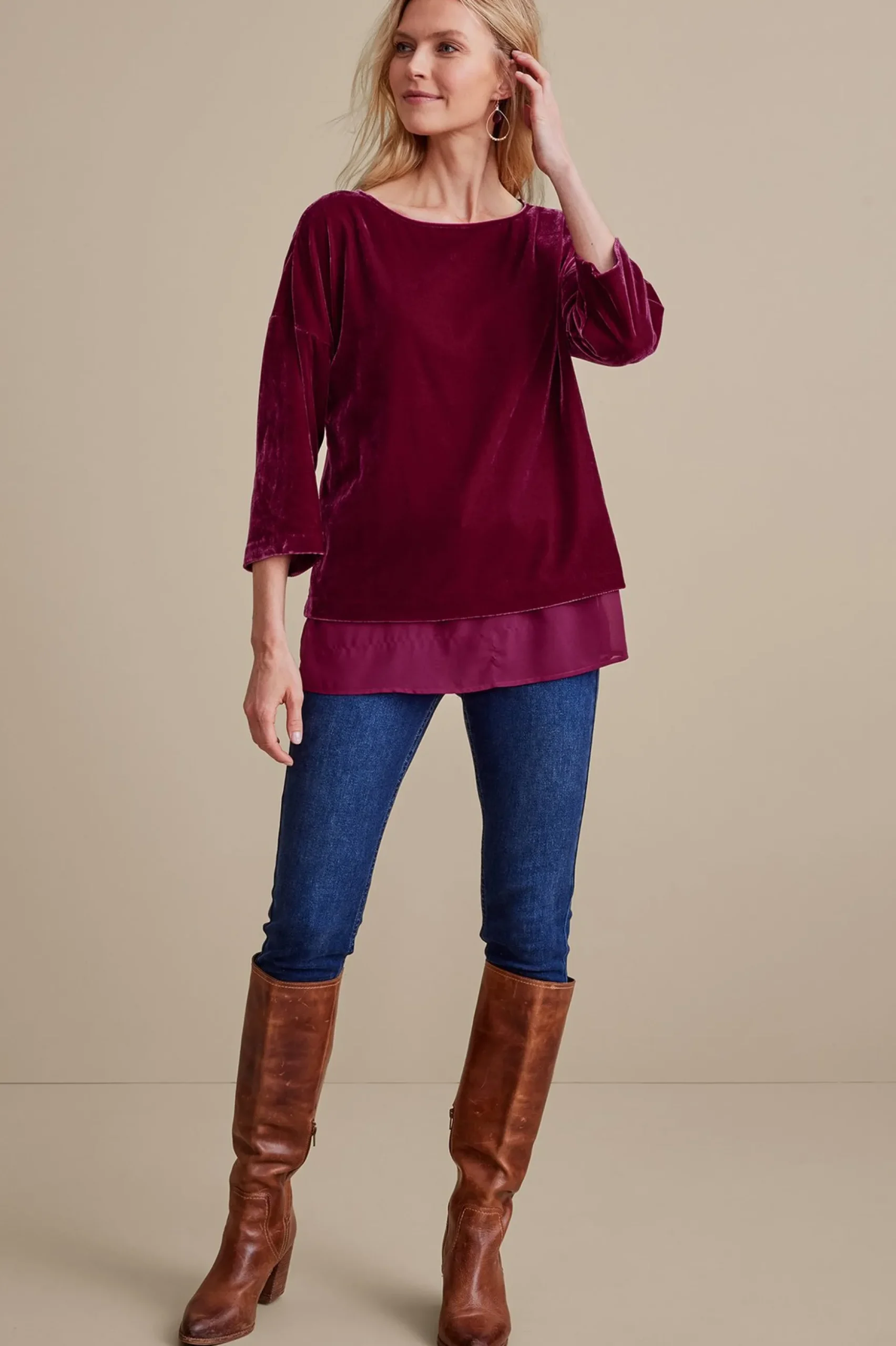 We love pairing a luxe fabric — like our softest velvet — with an unexpected silhouette. This casual style features easy dropped shoulders, slightly belled 3/4 sleeves, and a band of fluttery georgette peeking below the velvet hem.