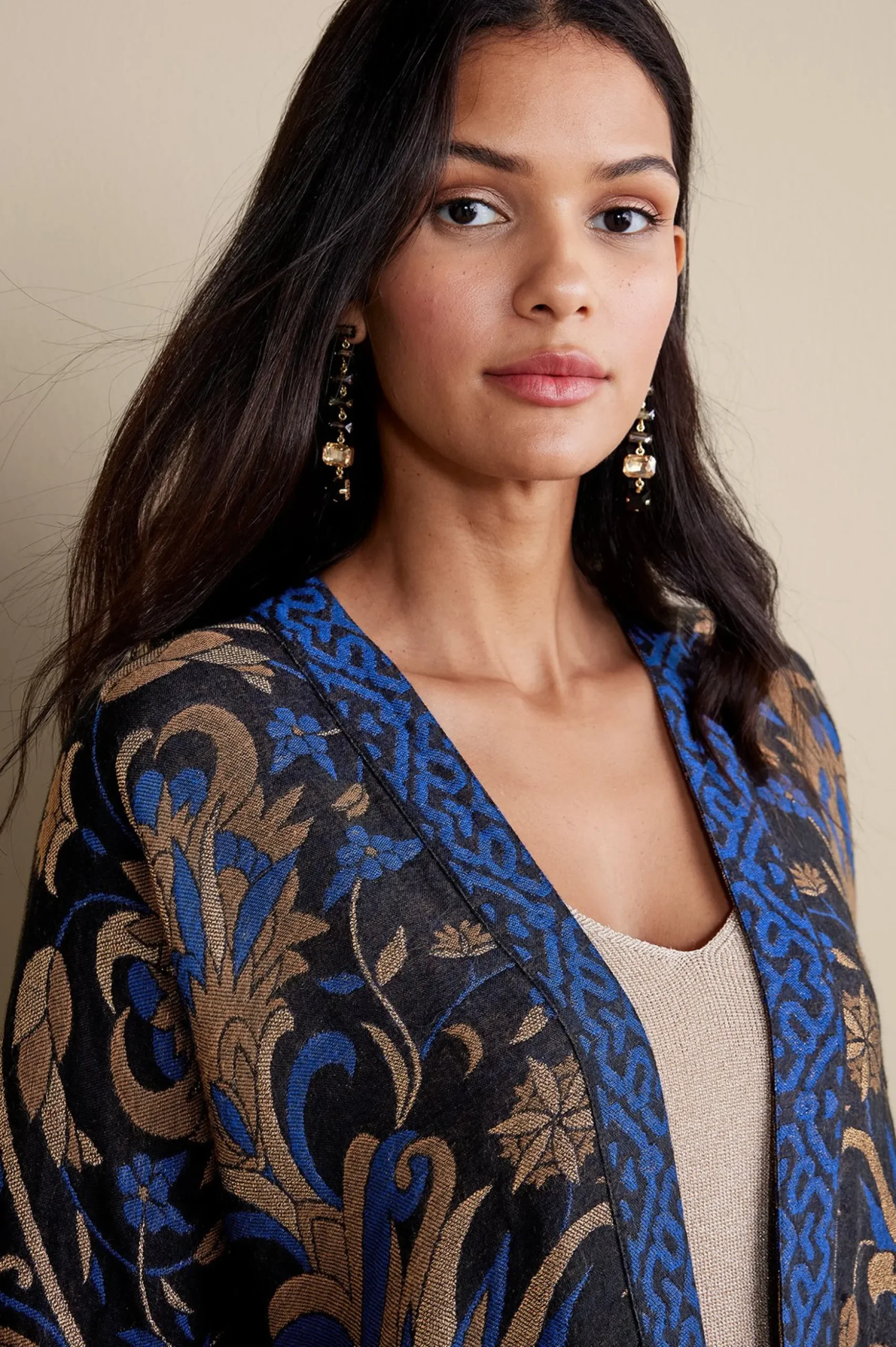 Effortlessly elegant, this drapey, dolman sleeve topper is made from intricately patterned jacquard fabric in midnight hues.