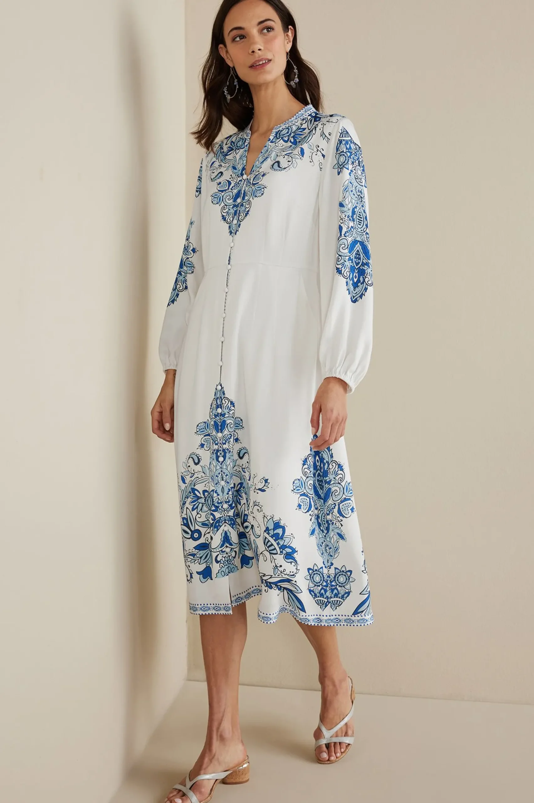 A Mandarin collar above the split neckline lends a tailored sensibility to this prettily printed button-front midi. Thoughtfully placed seams at the waist ensure an ultra-flattering fit, too.