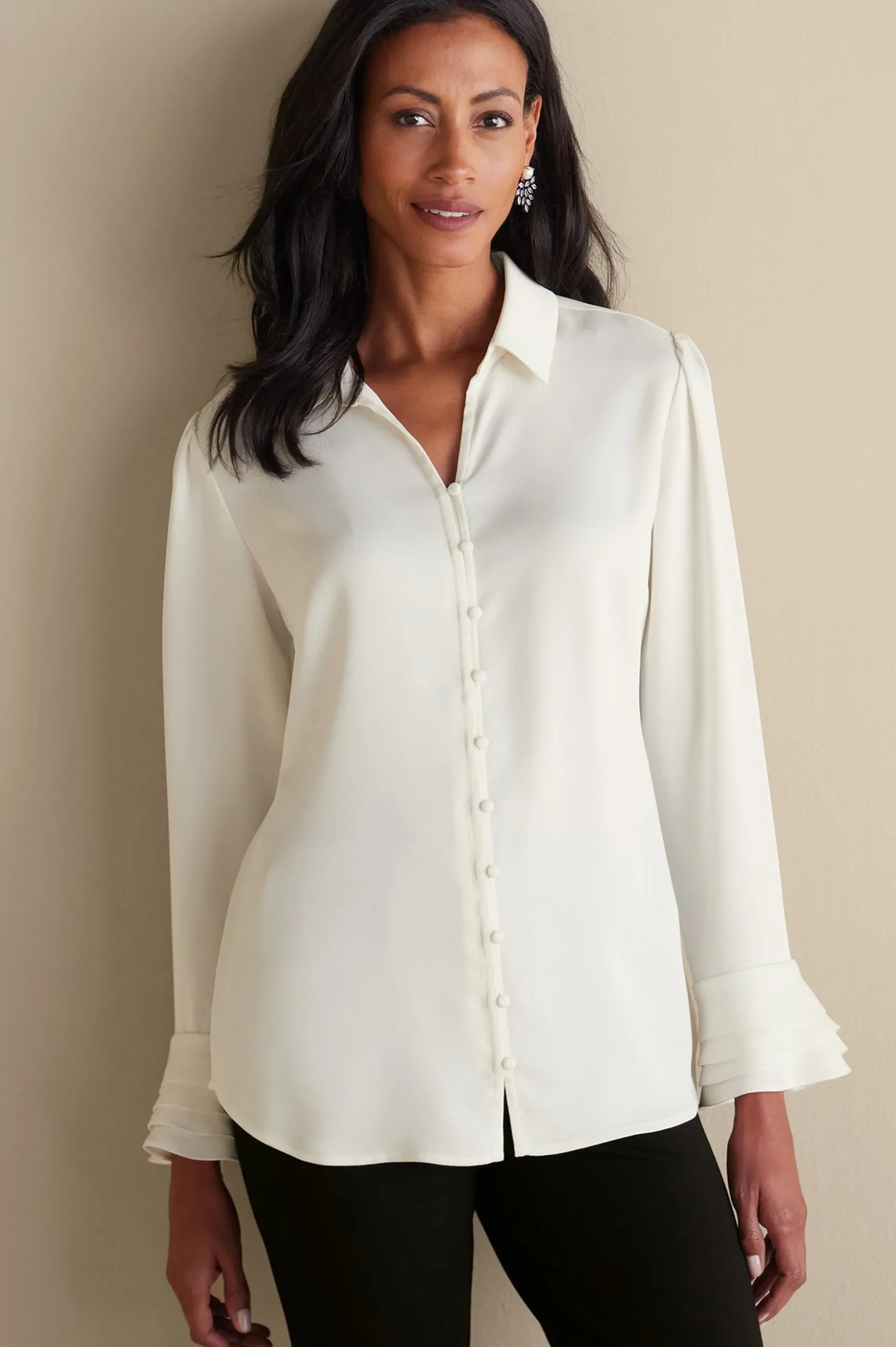 This dreamy blouse is pure poetry in motion with all the romantic details you love in a floaty top: covered loop buttons, tiered ruffle sleeve cuffs, and phenomenal shaping that nips in just the right places.?