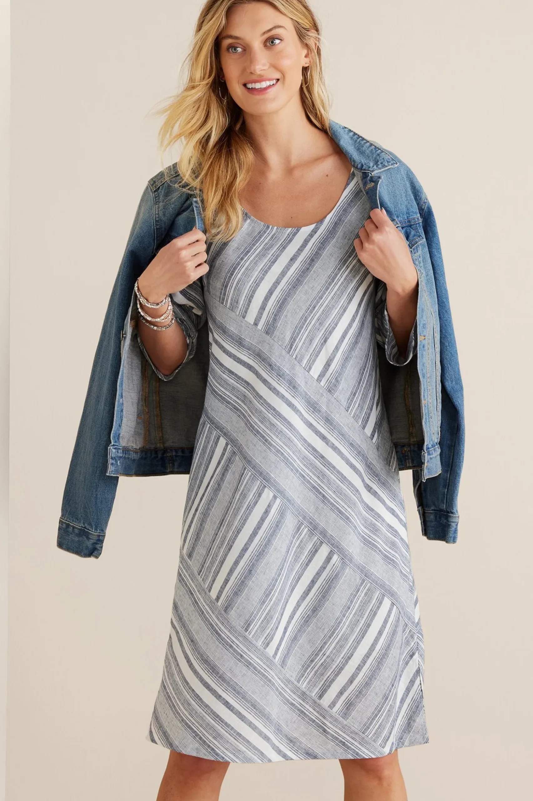An easy linen-blend dress is everything we love about spring and this one has so much more to love, love, LOVE. Blended with viscose, the fabric is so comfy and stays looking great all day. The paneled stripes are unbelievably flattering, visually “slimming” a shapely silhouette. It’s the perfect, running around, dress it up or down, dress. Front/back lining, knee length, 3/4 sleeves.