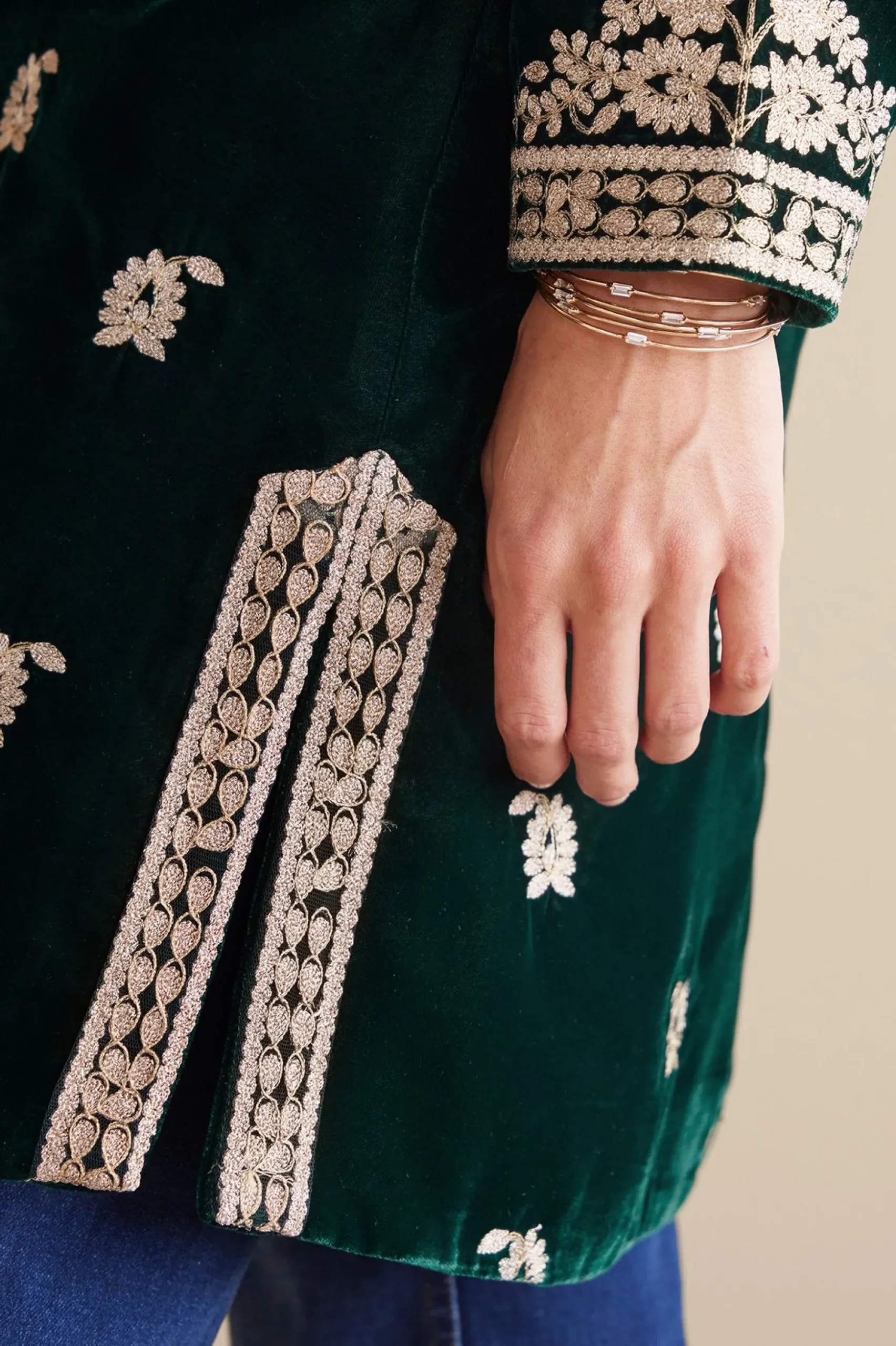 Crafted from our signature velvet, this artfully designed jacket is delightfully soft and lightweight. The regal, emerald velvet is embellished all over with shimmery white gold embroidery, even on the side slits. Hidden hook and eye closures nip in at the waist. Full lining.