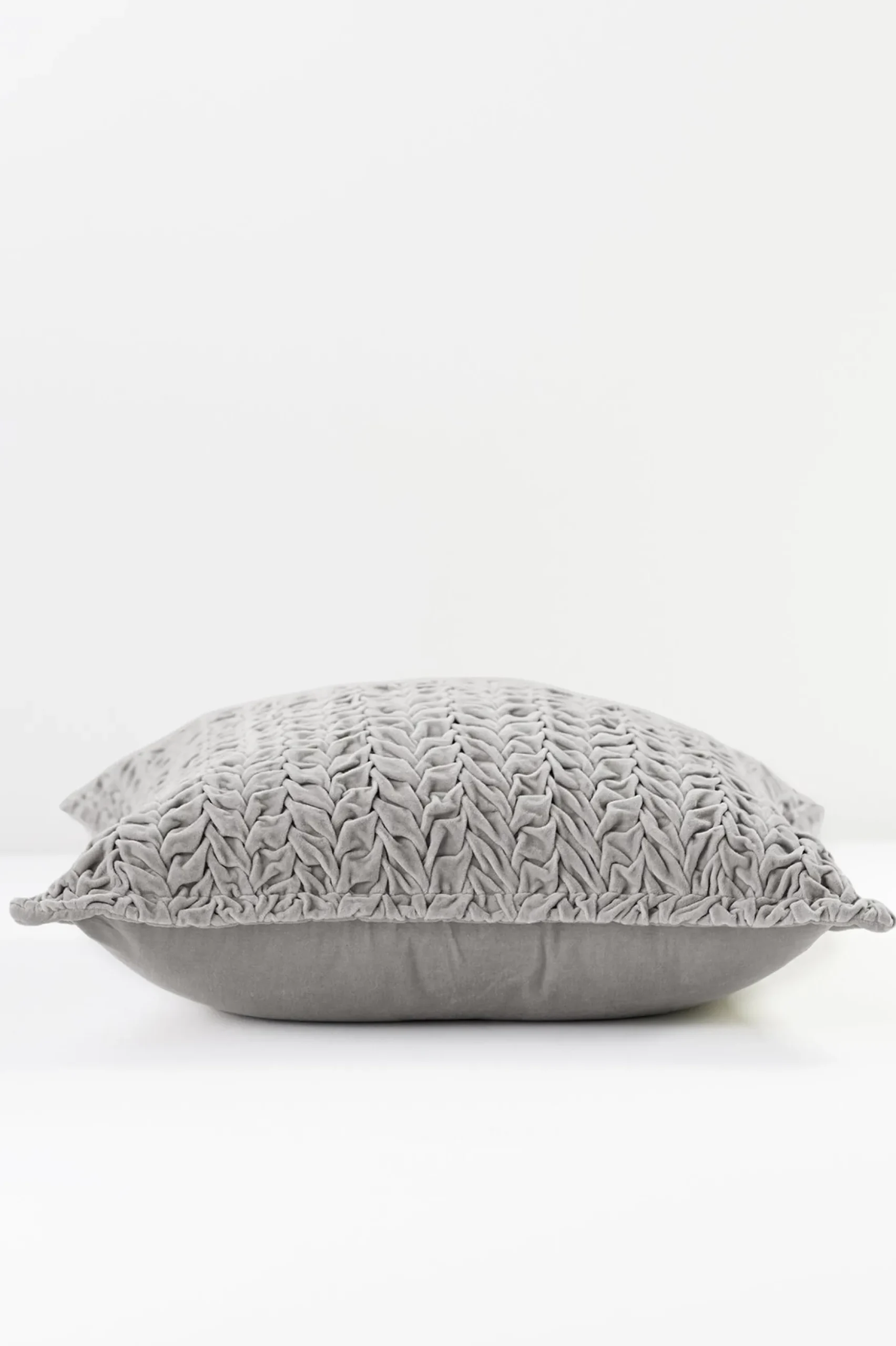 Yards of luxe, grey cotton velvet are hand-gathered and sewn to create this beautiful, basketweave pillow. It’s a lovely, textural accent for your plush bed, cozy chair, or your favorite reading nook. Removable, washable cover.