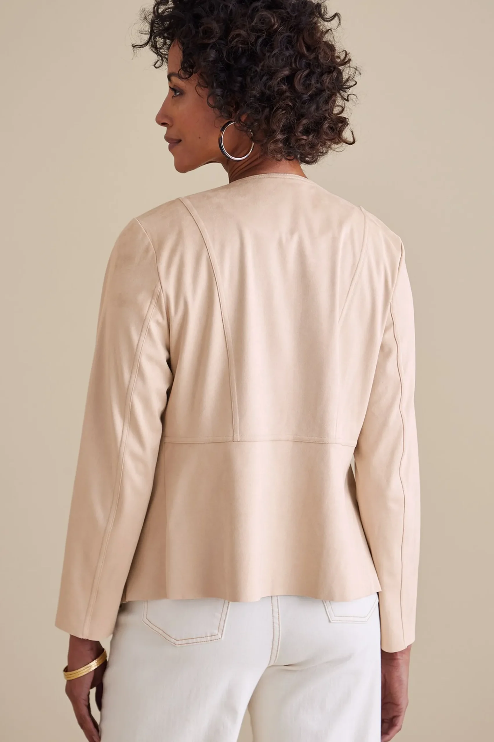 We love, love, love the drapey texture of this unbelievably soft, vegan suede jacket. Laser-cut edges keep the look clean and modern. Princess seams and back waist seaming give great shape. Did we mention it has pockets?! Unlined and lightweight.