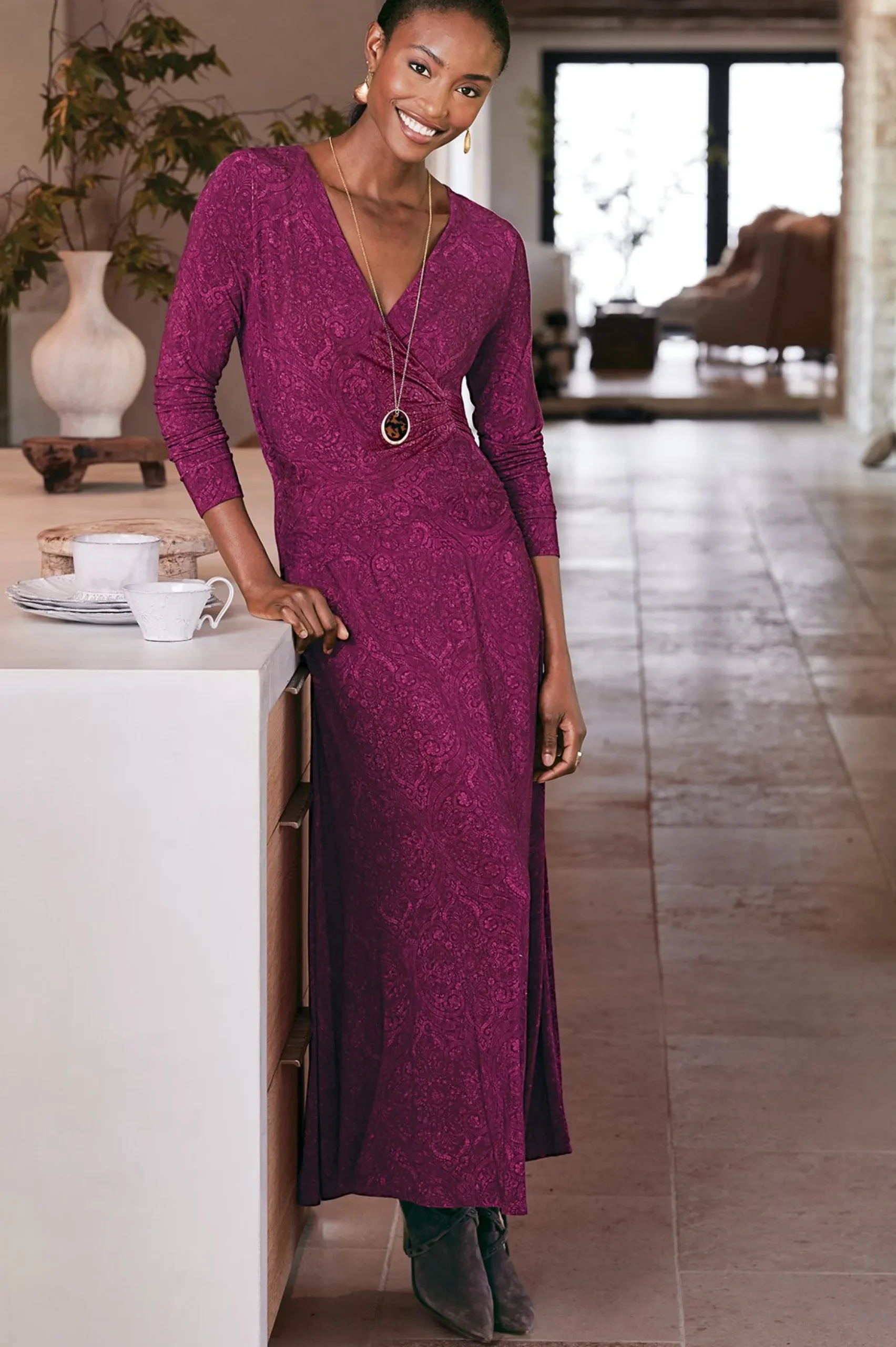Magical draping and self-ties create phenomenal waist shaping and figure flattery on this soft knit dress. In a berry-hued tonal tapestry, this vintage-inspired maxi features a surplice top. The effect is so slimming and chic. Front slit. Long sleeves.