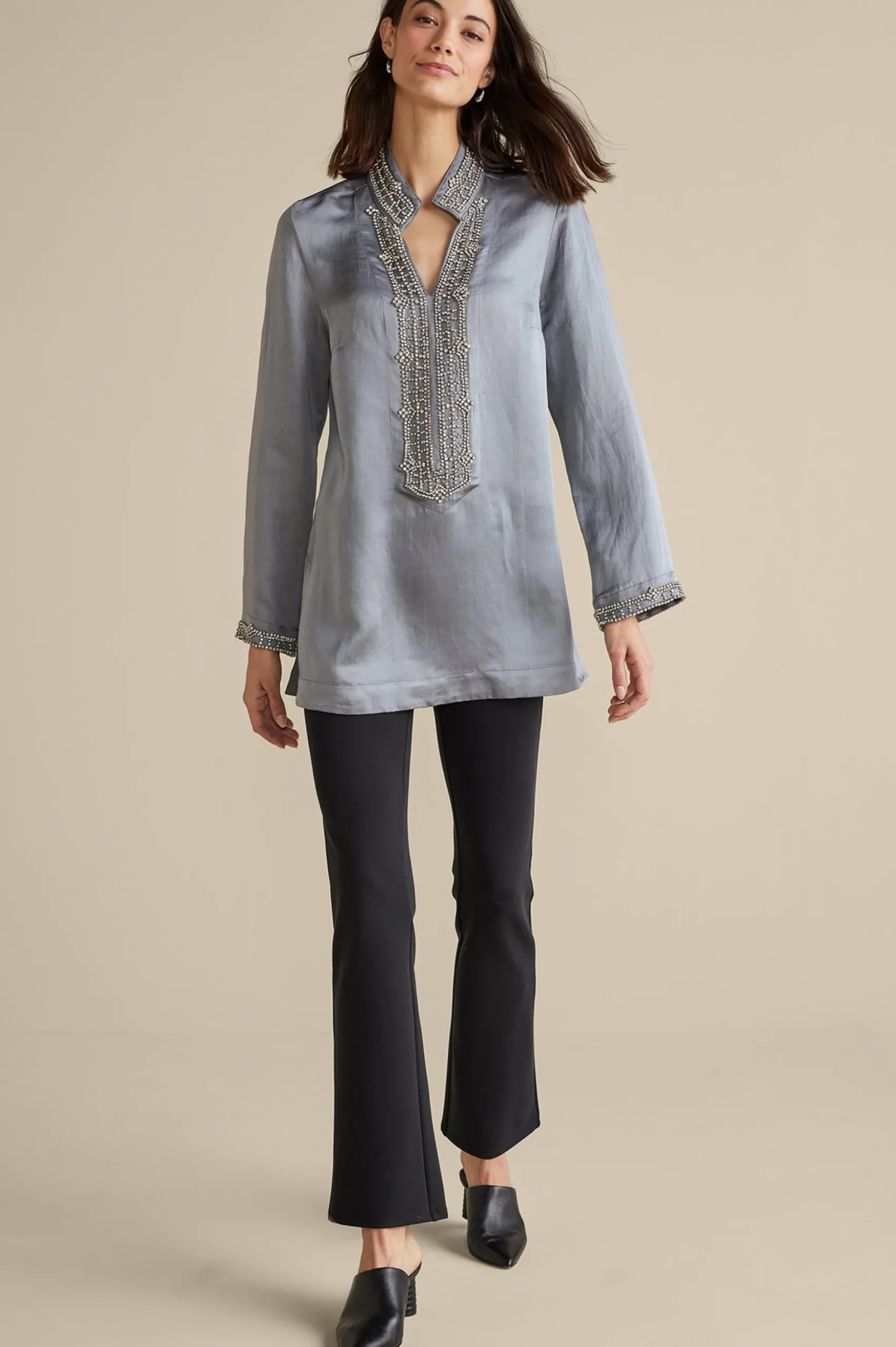 Bejeweled embellishments adorn the front placket, stand collar, and cuffs of this elevated tunic.