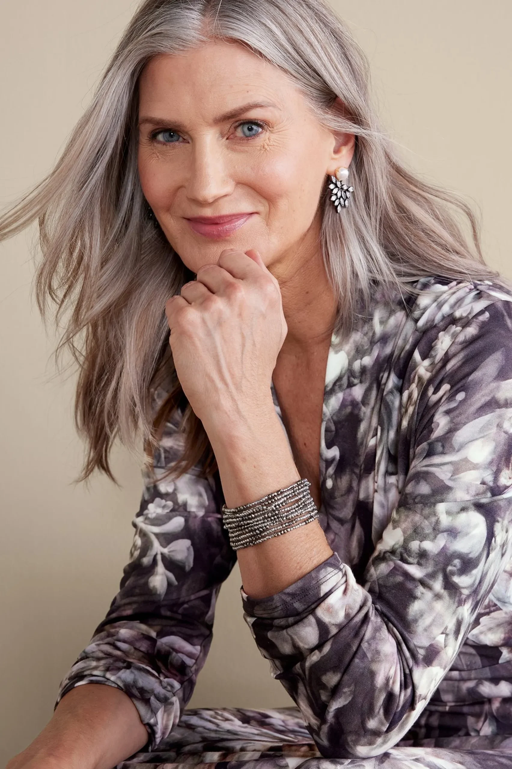 Moody florals with touches of rose, blush, and mint top the wonderfully soft fabric of this knit dress. Shirring at the neck and shoulders adds architectural interest to the V-neckline, while angled waist seams and a full skirt create a chic silhouette. Back zip.