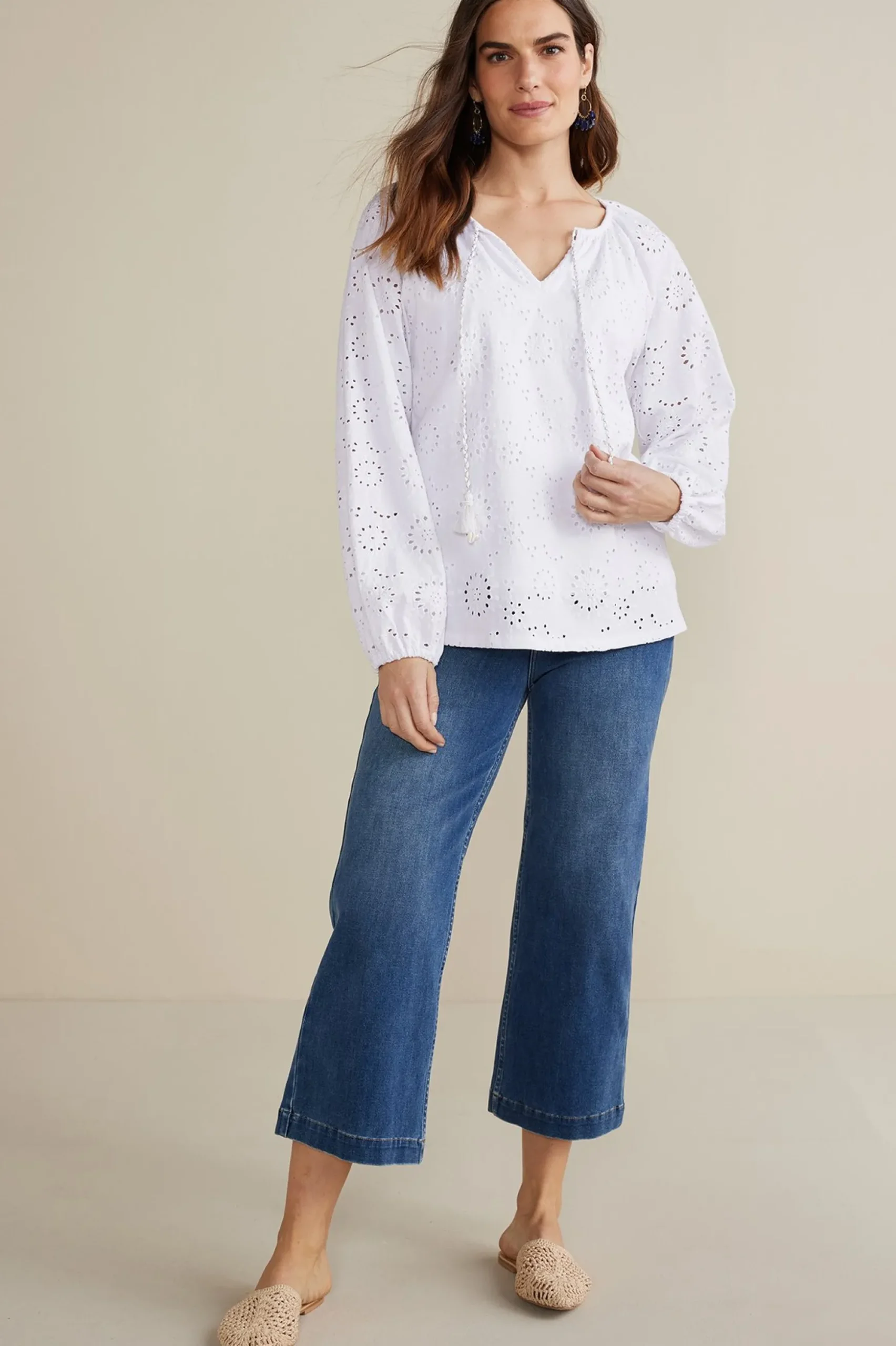 Bohemian meets breezy in this cotton eyelet peasant top. Tasseled drawstrings trim the split V-neckline, while elastic cuffs gather the long raglan sleeves for an airy, voluminous silhouette. Lined body.