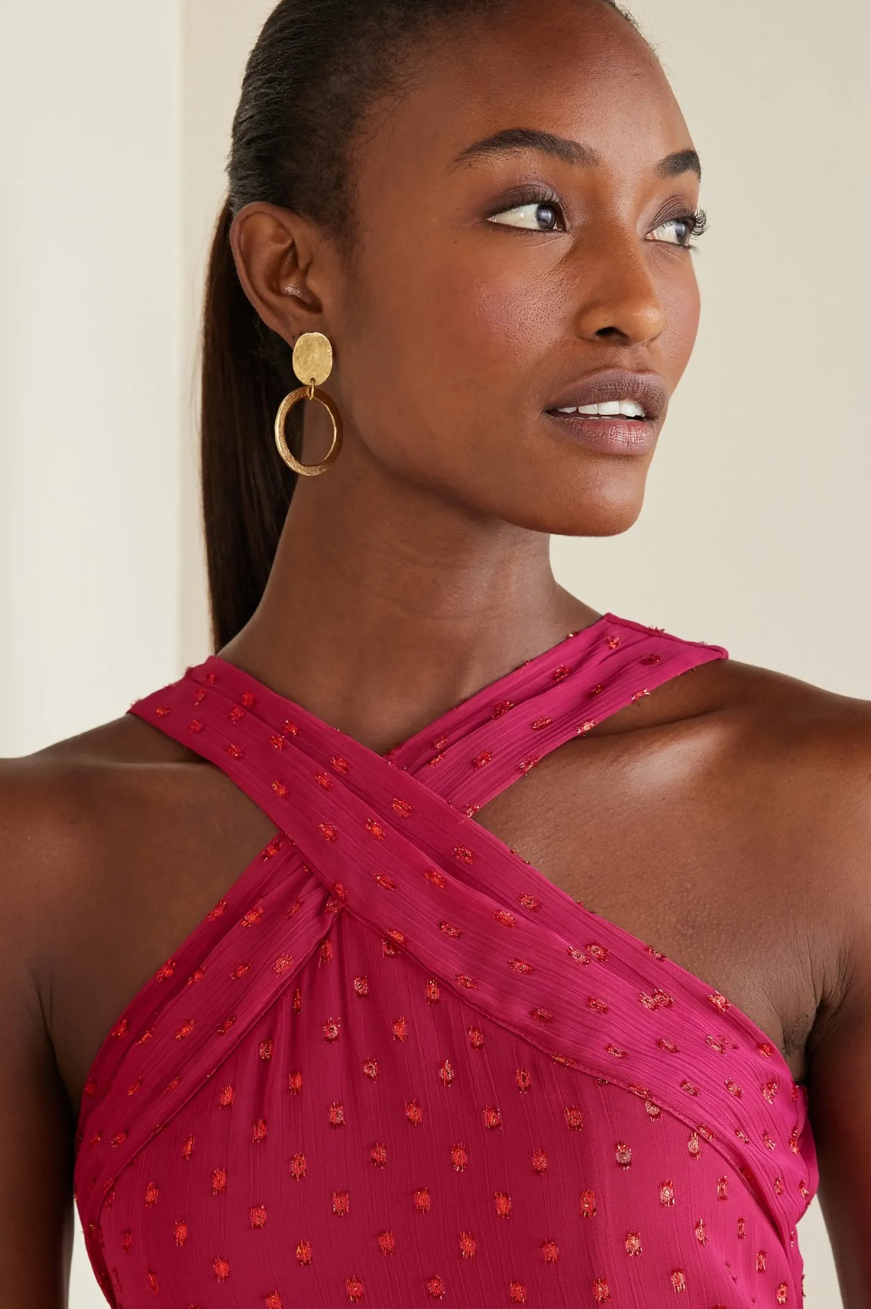 Special occasions call for a look that shines bright, and this maxi dress is ready for any RSVP on your calendar. Dusted with sparkling metallic details, this show-stopping style features a fitted, halter neck bodice with adjustable ties, hidden back zipper, and a skirt tiered with deep ruffles that will sway as you dance the night away.