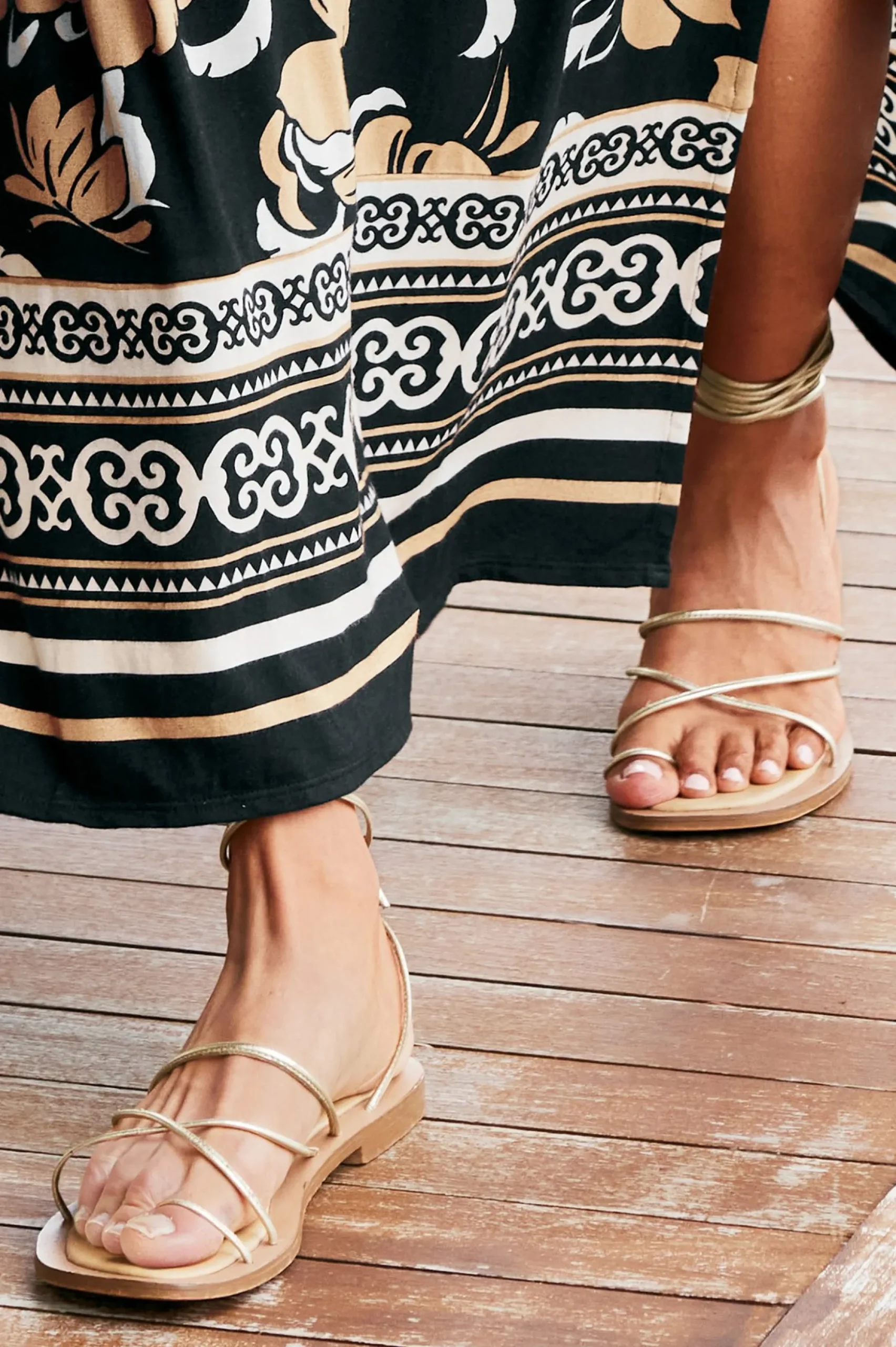 The forever-favorite gladiator sandal adopts a graceful, barely-there appearance with thin bands of golden leather elegantly wrapping your foot and ankle. Leather lining and synthetic sole.