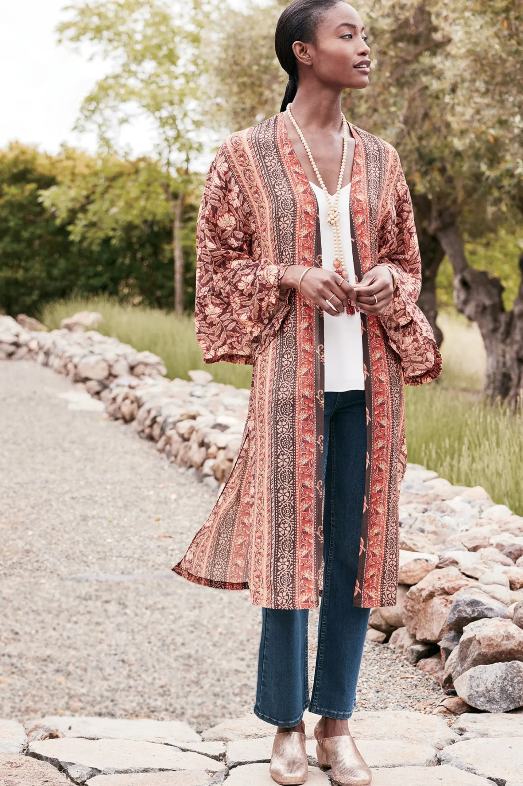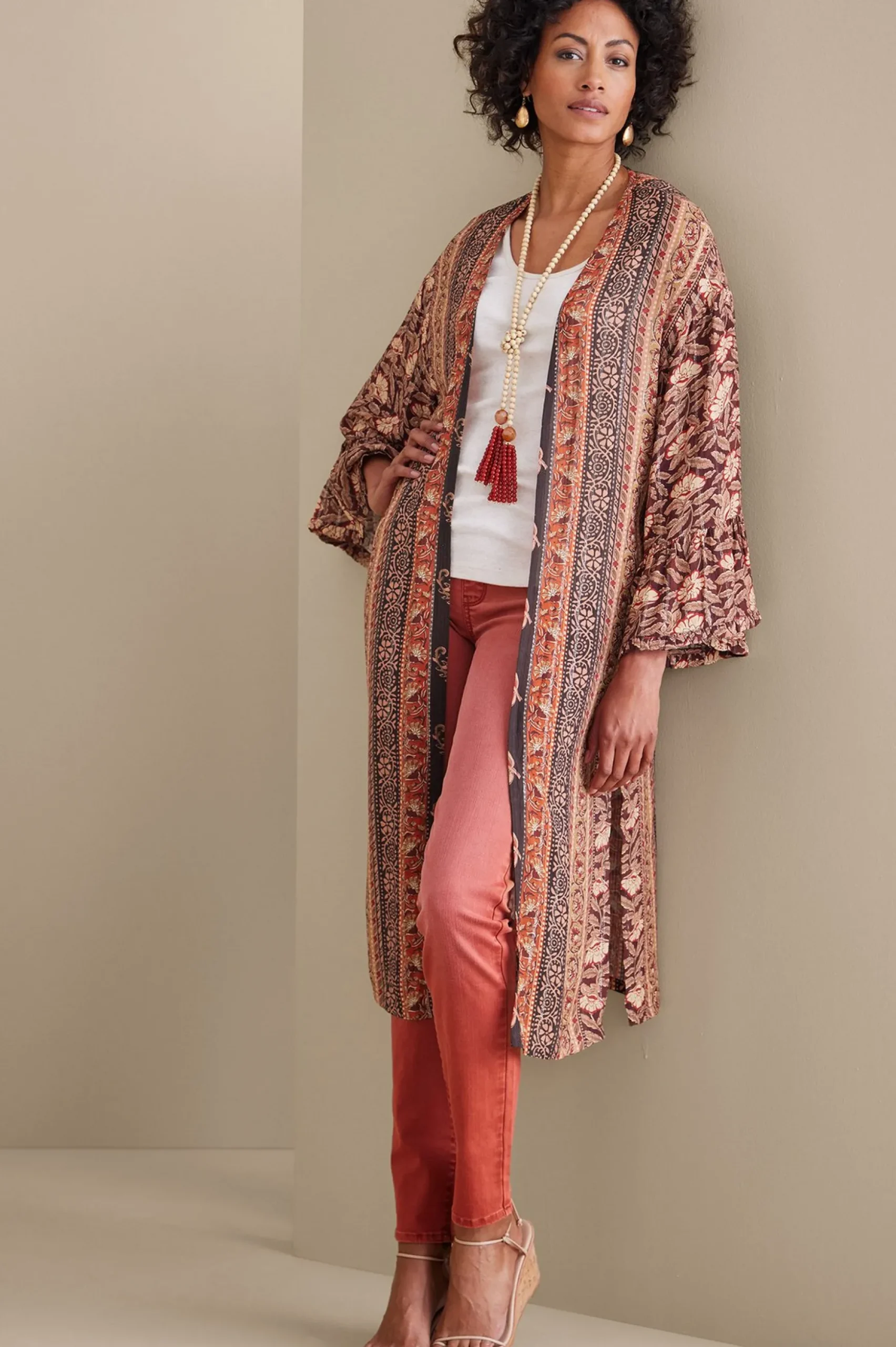 The warmth of summer still colors early fall days, calling for lightweight layers. This globally inspired topper is a beautiful look, featuring a mix of patterns enriched by deep hues of salmon, russet, ruby, and black. Details include ruffled bell sleeves, deep side slits, and triple bands of metallic stitching dripping from shoulder to hem for subtle shimmer. It’s a cool style designed to be worn open over jeans or jumpsuits.